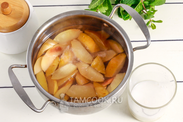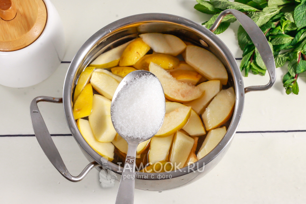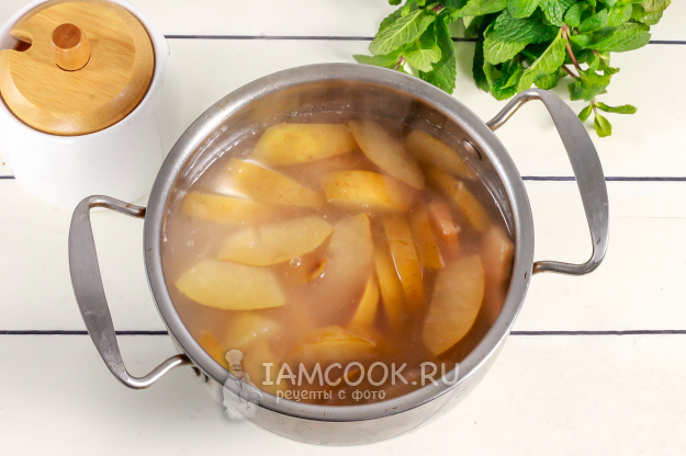 Поместите емкость на плиту, включая максимальный нагрев, и всыпьте сахарный песок. Доведите жидкость до кипения и уменьшите нагрев до умеренного. Отварите компот примерно 12-15 минут до мягкости айвовой нарезки.