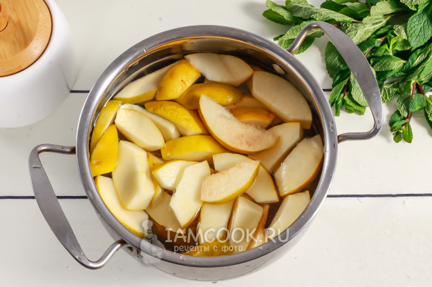 Тщательно промойте каждый фрукт в воде, смывая ворсистый слой жесткой стороной губки. Разрежьте плоды на части и вырежьте семенные блоки. Затем быстро нарежьте промытую мякоть ломтиками и высыпьте в кастрюлю. Влейте 500 мл теплой воды и всыпьте лимонную кислоту. Это нужно сделать как можно быстрее, так как айвовая мякоть очень быстро темнеет при соприкосновении с воздухом.