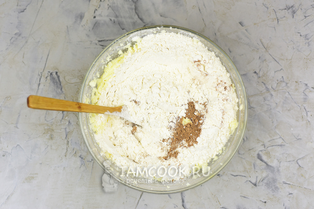 К полученной массе добавим какао, разрыхлитель, ванилин и муку.