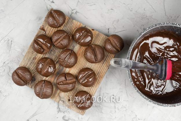После чего приготовим глазурь: 20 г масла сливочного растопим на маленьком огне в сотейнике и в горячем масле размешаем 50 г темного шоколада до получения гладкой глазури. Каждую печенюшку покроем тонким слоем глазури с помощью кондитерской кисти.