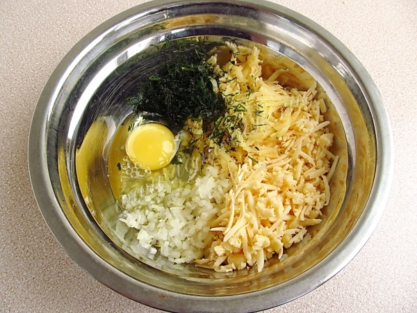 Соединить картофель, лук, сыр, укроп и сырое яйцо.