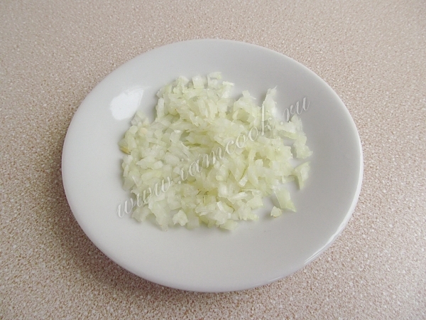 Луковицу очистить и очень мелко нарезать, а затем ещё и порубить ножом.
