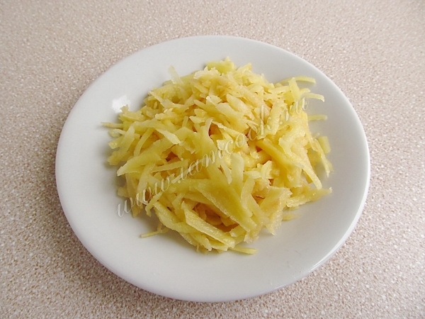 Картофелину вымыть, очистить и натереть на крупной тёрке.