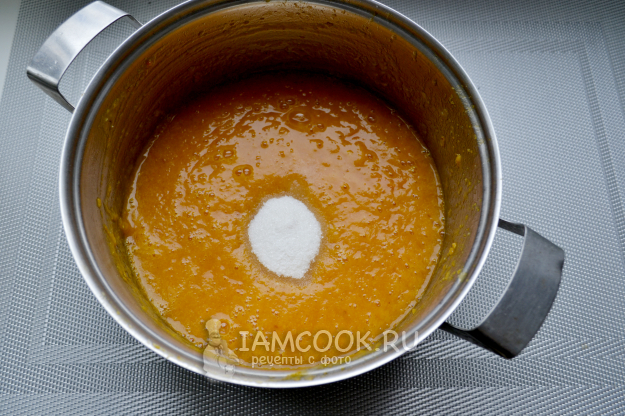 Всыпьте в абрикосовое пюре сахар по вкусу.