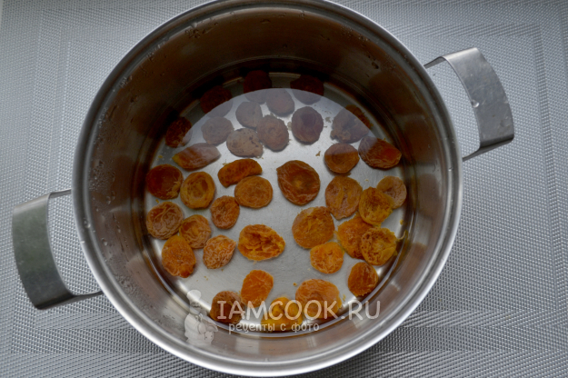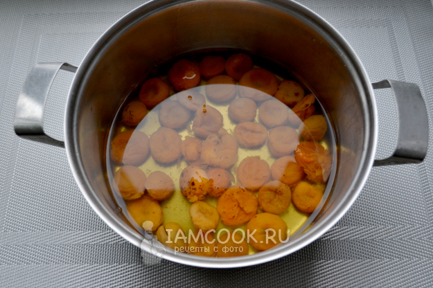 Курагу тщательно промойте, залейте чистой водой и поставьте кастрюльку на огонь.