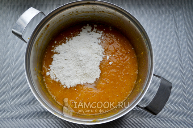 Всыпьте пшеничную муку и сразу венчиком перемешайте, чтобы не осталось комочков.