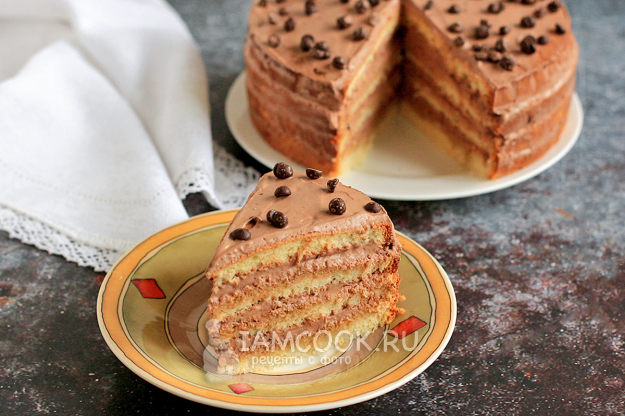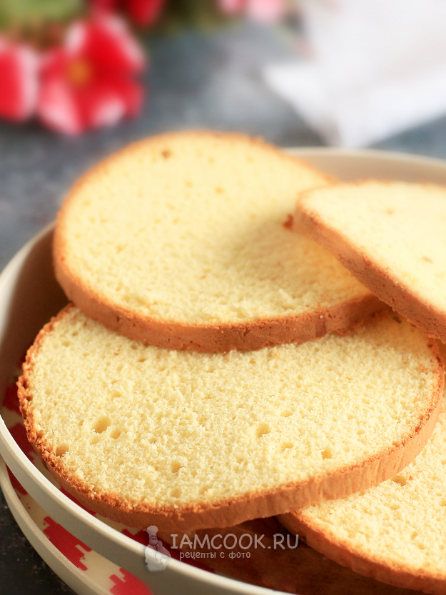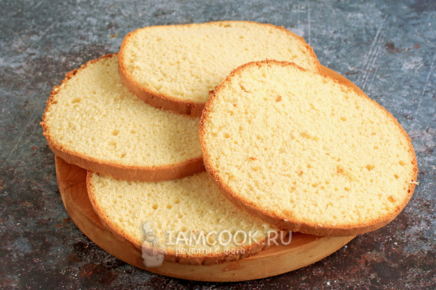 Он легко разрезается на 4 коржа, получается рыхлым и пышным, но при собирании торта нуждается в пропитке. Используйте любой крем по вашему вкусу.