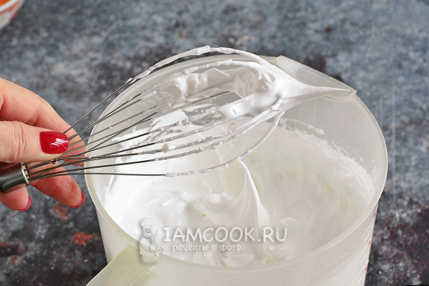 Взбивайте белки с сахаром до глянцевого блеска и плотных пиков (вершин), постарайтесь сахар полностью растворить.