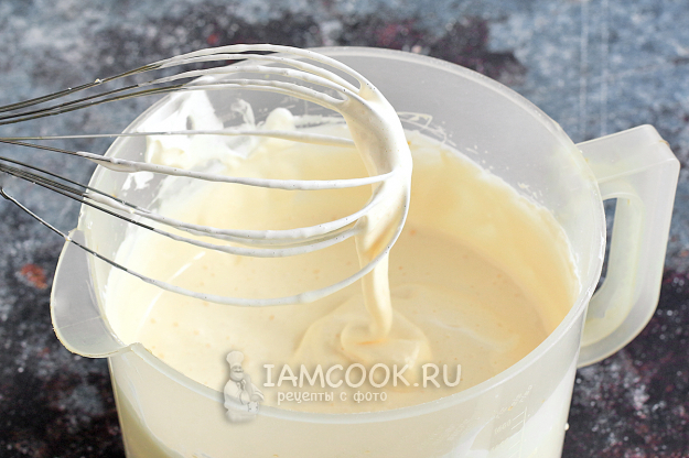 Взбитые яйца с сахаром густо стекают с венчика и оставляют на поверхности видимый след, который не исчезает несколько секунд.