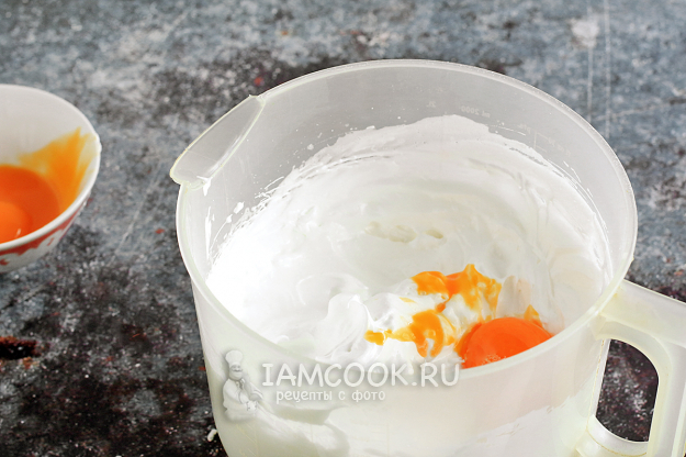 Теперь по одному добавляйте желтки, каждый раз взбивая смесь до однородности и пышности. После добавления желтков смесь станет немного жиже, но останется пышной.