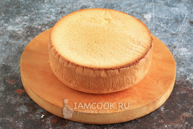 Классический ванильный бисквит готов, его высота - 6 см. Обычно для дальнейших манипуляций нужно дать ему созреть, чтобы при нарезании он не крошился. Для этого оберните бисквит пищевой пленкой и положите на ночь в холодильник. Ускорить процесс можно, если положить бисквит на час в морозилку, а затем дать нагреться при комнатной температуре.