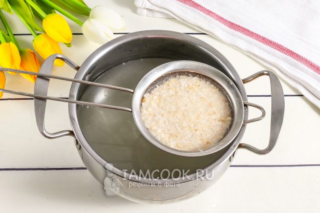 Процедите жидкость с овсяными хлопьями через ситечко и слегка протрите и сам жмых. Затем его удалите. Многие советуют варить кисель из прозрачной сыворотки, но я пробовала - он не становится густым! Поэтому обязательно протрите немного и набухшие овсяные хлопья.