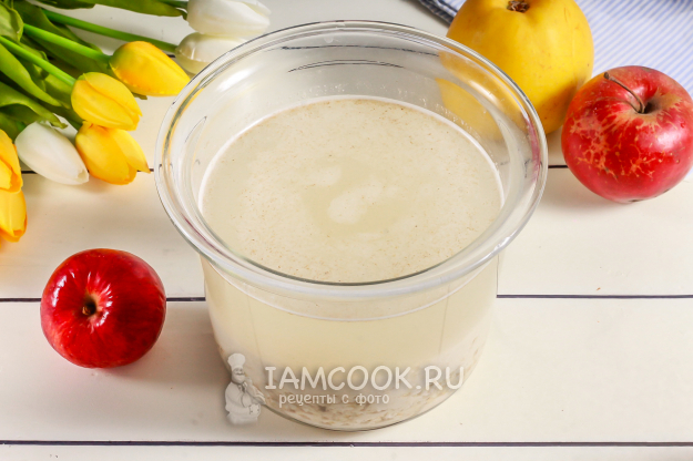 Овсяные хлопья быстрого приготовления или обычный «Геркулес» всыпьте в глубокую емкость и залейте 400 мл отфильтрованной или охлажденной кипяченой воды. Оставьте на сутки при комнатной температуре, аккуратно перемешивая содержимое емкости 3-4 раза в течение всего срока.