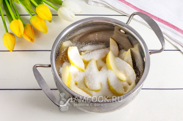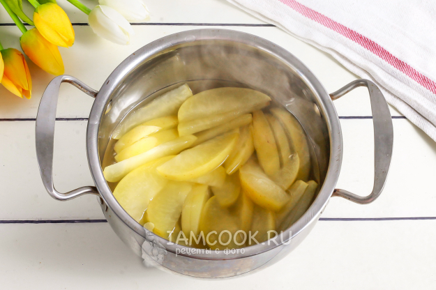 Яблоки промойте в воде, разрежьте на две или четыре части и вырежьте семенные блоки. Промойте еще раз и нарежьте ломтиками. Всыпьте нарезку в кастрюлю и добавьте сахарный песок. Можно приготовить кисель и без сахара, добавляя мед или другой подсластитель прямо в тарелку при подаче.