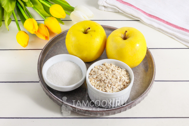 Возьмите необходимые ингредиенты для приготовления густого монастырского овсяного киселя с яблоками.