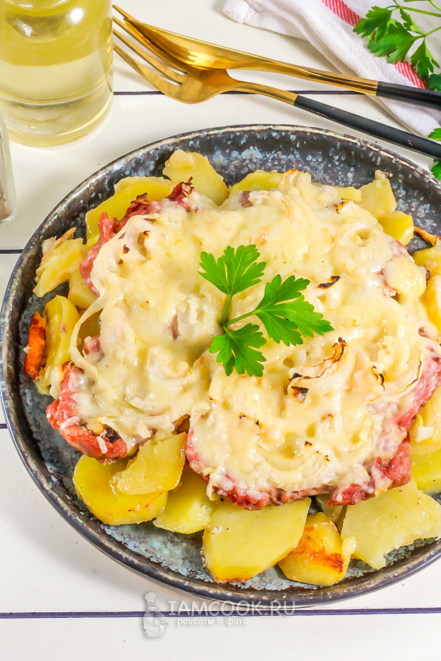 Затем выложите мясо по-французски с маринованным луком на тарелку и подайте к столу горячим, чтобы сыр еще тянулся.