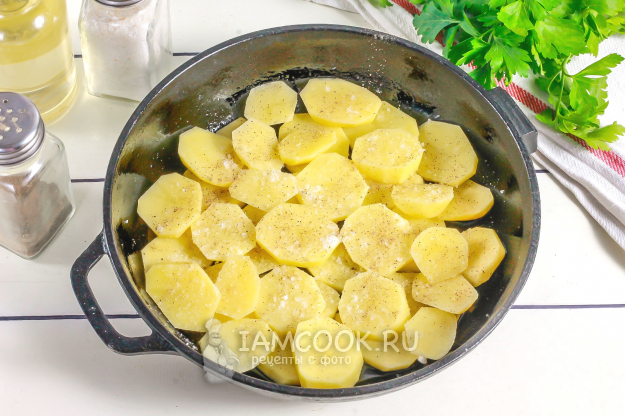 В это время смажьте форму для запекания растительным или сливочным маслом. Нарежьте картофель кружочками толщиной не более 0,5 см. Выложите нарезку в форму, посолите и поперчите.