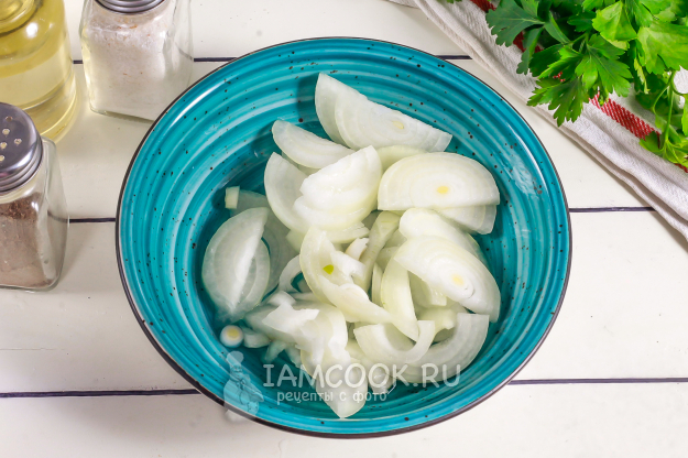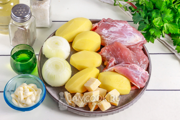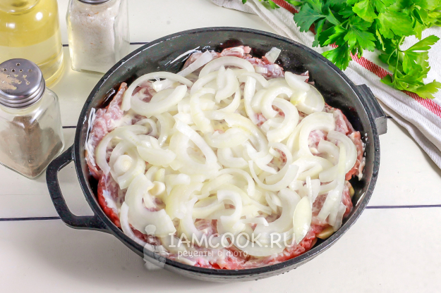Подготовьте необходимые ингредиенты для мяса по-французски с маринованным луком.