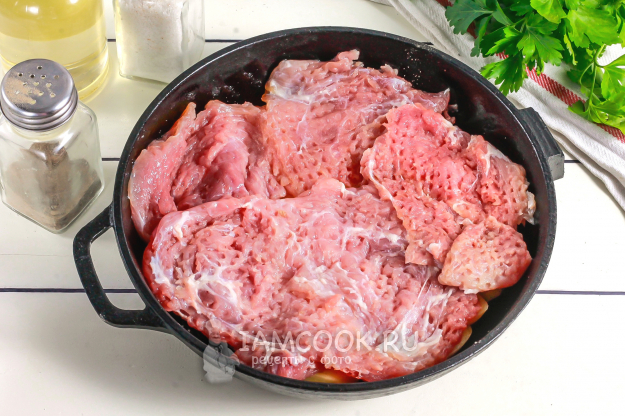 Свинину промойте в воде, срежьте жилы и пленки с мяса, если таковые присутствуют. Отбейте мясо кулинарным молоточком и выложите на слой картофеля.