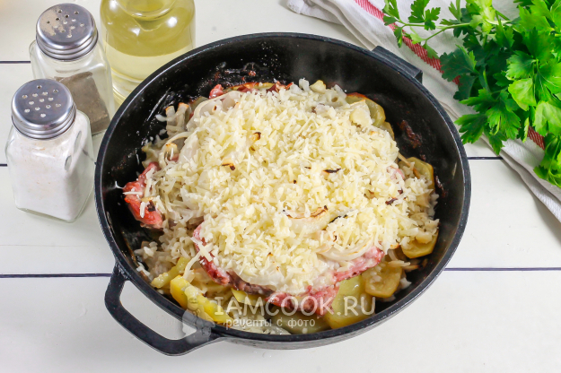 В это время натрите твердый сыр на терке с мелкими ячейками. Извлеките форму и присыпьте блюдо натертым сыром. Запеките еще 5-10 минут.