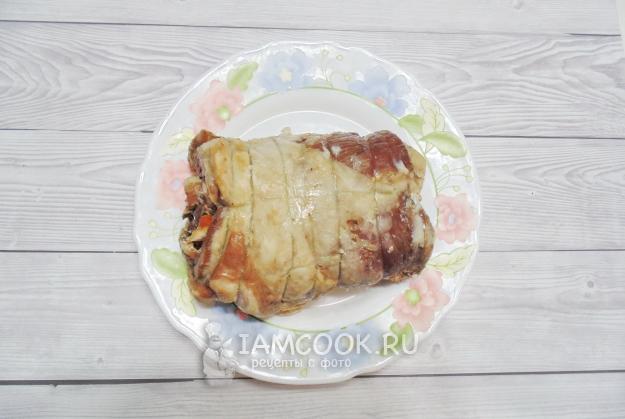 Рулет из подчеревка, запеченный в духовке, готов к подаче на стол.