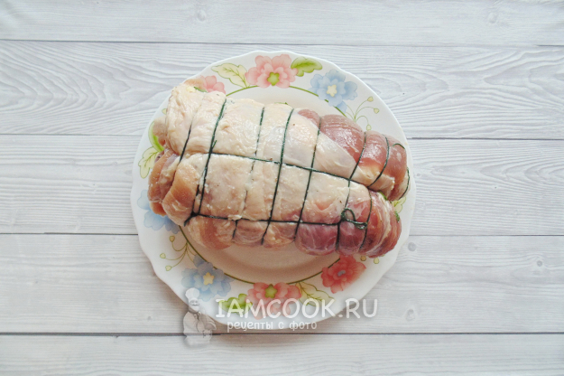Запекайте рулет в духовке, разогретой до 185-190 градусов, 1 час 30 минут. После достаньте из духовки и освободите от ниток.