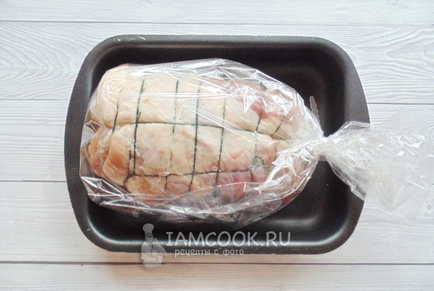 Выложите рулет в рукав или пакет для запекания и закрепите клипсой.