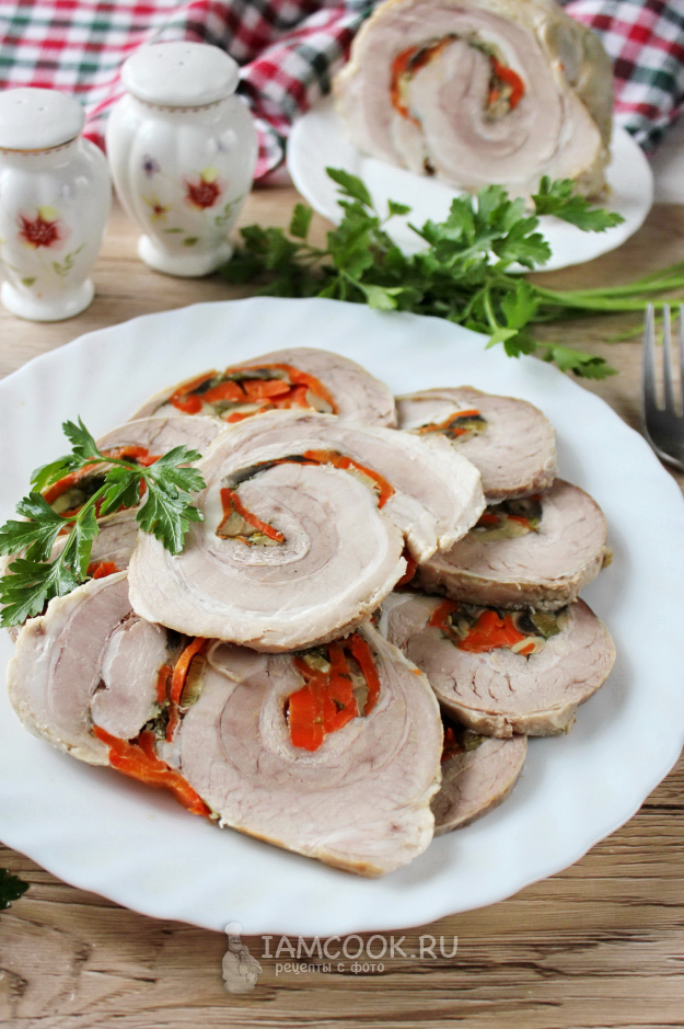 Дайте рулету хорошо остыть, нарежьте и подавайте к столу с горчицей, хреном, соусами.