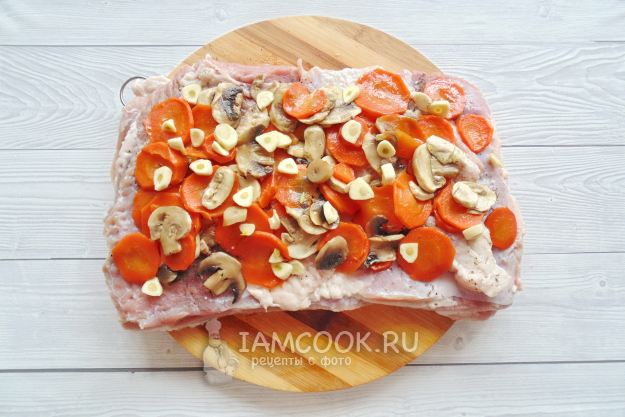 Чеснок очистите, нарежьте пластинками и выложите на подчеревок.