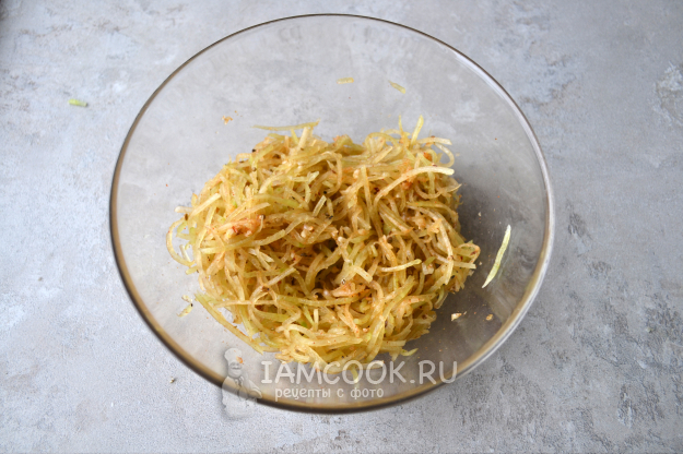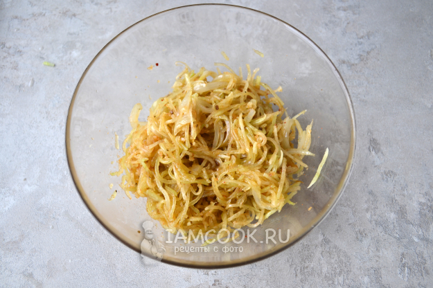 Переложите натертую редьку в глубокий салатник, посолите, перемешайте руками. Оставьте редьку на 15-20 минут, чтобы она дала сок.
