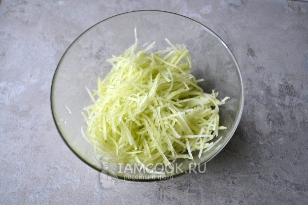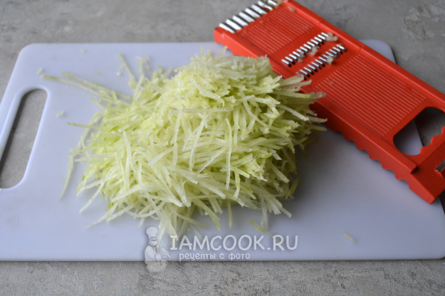 Редьку очистите от кожуры и натрите на терке. Редька будет лучше смотреться в салате, если натереть ее тонкой соломкой на терке для корейских салатов.