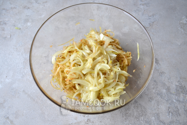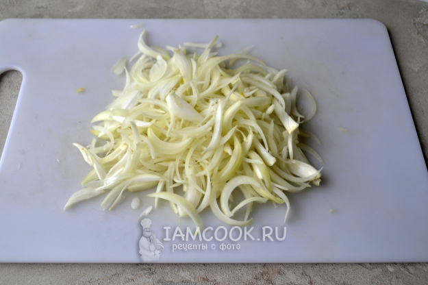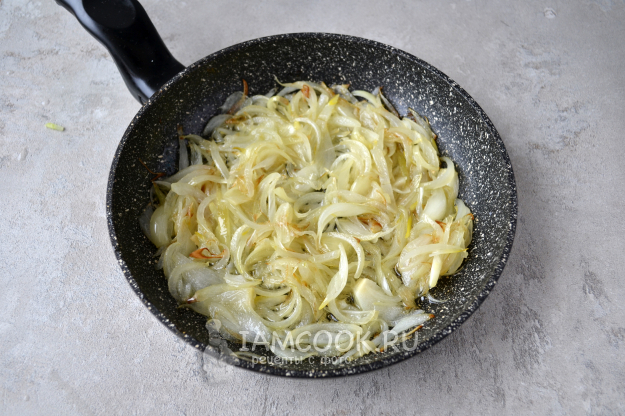 Обжарьте лук в растительном масле до легкого золотистого цвета. Посыпьте лук во время обжаривания щепоткой сахара.