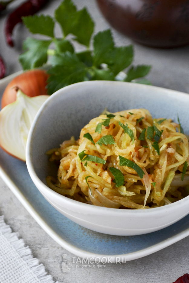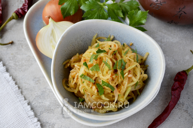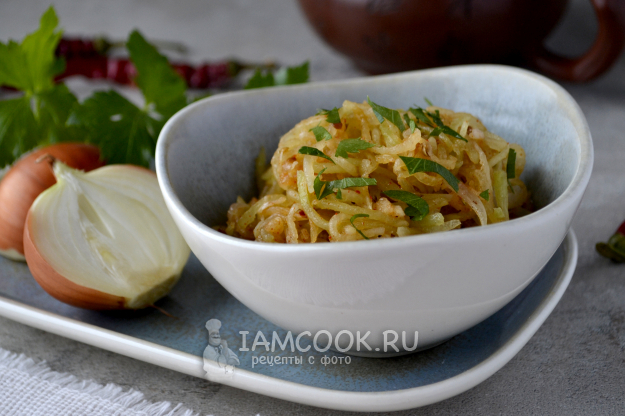Перед подачей посыпьте зелёную редьку по-корейски свежей зеленью.