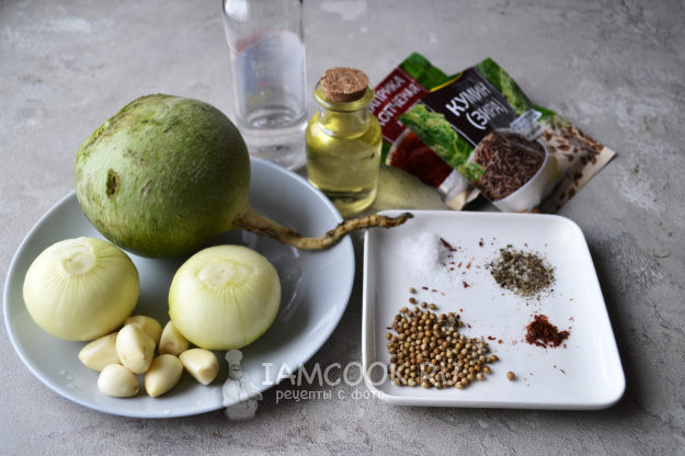 Возьмите продукты для приготовления зеленой редьки по-корейски. Редьку тщательно вымойте, чеснок и лук очистите от шелухи.