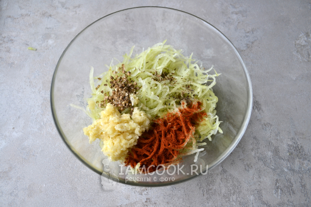 Слейте образовавшийся сок и дополнительно отожмите сок из редьки руками. Посыпьте редьку черным молотым перцем, копченой паприкой, красным острым перцем, измельченными семенами кориандра. Чеснок пропустите через пресс и добавьте к редьке. Добавьте уксус.