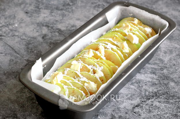 Поверхность яблок посыпьте сахарной пудрой, смешанной с корицей. Сверху разложите малюсенькие кубики сливочного масла. Выпекайте яблочный пирог «Необычный» в разогретой до 170 градусов духовке примерно 50 минут. Все духовки пекут по-разному, так что ориентируйтесь по своей. Чтобы пирог не горел снизу, подложите под форму лист фольги. Готовность пирога проверьте шпажкой, нужно чтобы она после прокола выходила полностью сухой.