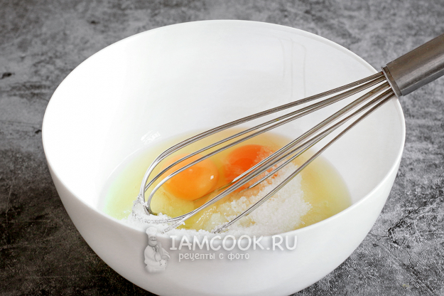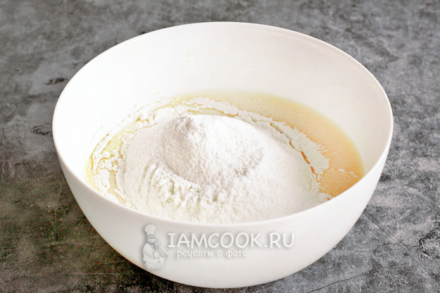 Муку просейте, смешайте с разрыхлителем и добавьте в яичную смесь. Перемешайте все ручным венчиком до однородного и гладкого теста. Выложите тесто в форму, смазанную маслом или выстланную силиконизированным пергаментом.
