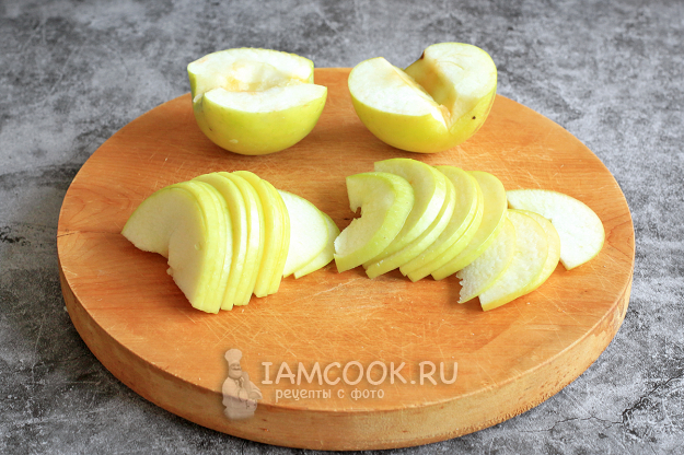 Яблоки тщательно вымойте, обсушите, разрежьте пополам, уберите серединку и нарежьте очень тонкими дольками (2 мм), как показано на фото.