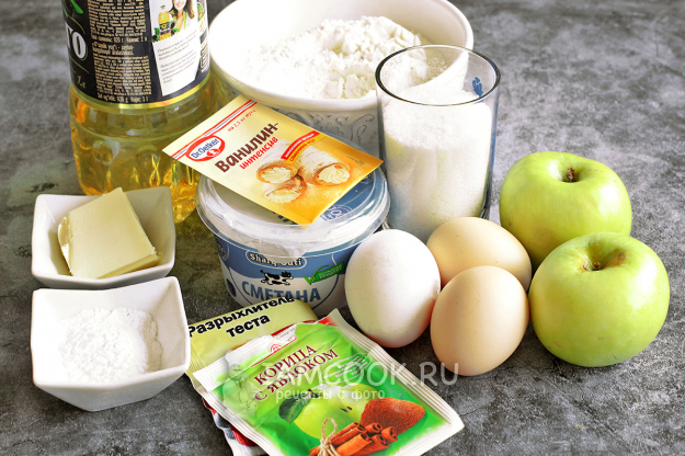 Чтобы приготовить «Необычный» яблочный пирог, возьмите привычные продукты по списку ингредиентов. Яблоки лучше всего взять кисло-сладкие, сочные и ровные.