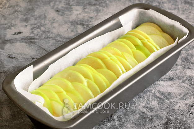 Дольки яблок вставьте в тесто «заборчиком», как показано на фото: одна долька вставляется в тесто вертикально слева, а следующая - уже справа, и так, чередуясь, до самого конца, пока не закроется вся поверхность теста.