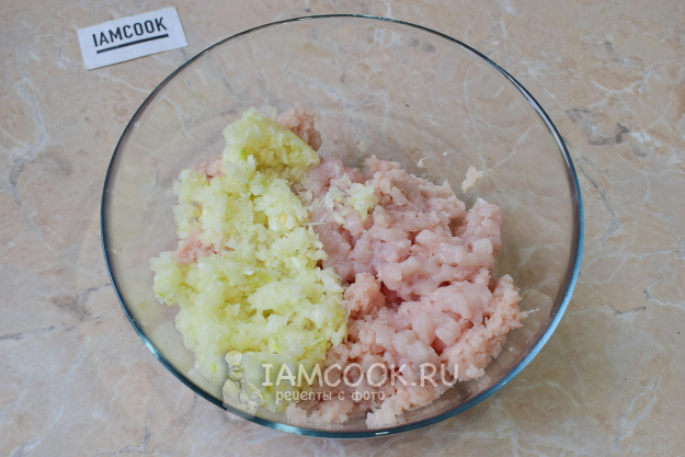 Нарезанное филе переложите в чашу, в которой будете готовить котлетную массу. Лук очистите, ополосните и очень мелко нарежьте. Добавьте измельченный лук в чашу к мясу.