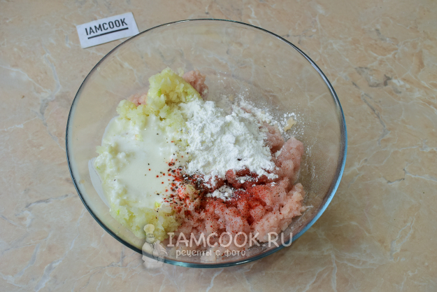 Влейте немного кефира и добавьте крахмал. По вкусу подсыпьте соль и специи. В качестве специй я использую паприку и смесь молотых перцев. Количество кефира и крахмала можно немного изменить по консистенции готовой котлетной массы. Кефир придаст котлетам сочности.