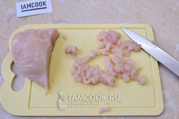 Куриное филе нарежьте как можно мельче. Удобно будет резать, если филе немного подморозить.
