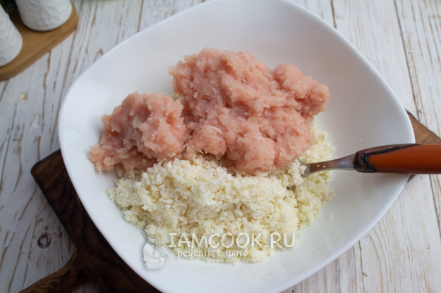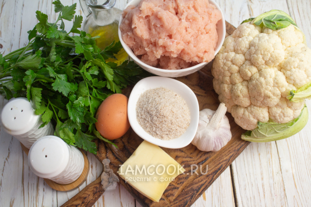 Возьмите все необходимые ингредиенты для приготовления куриных котлет с цветной капустой в духовке.