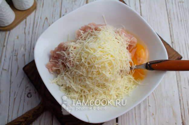 Сыр натрите на мелкой терке, добавьте его к фаршу, а также вбейте яйцо.