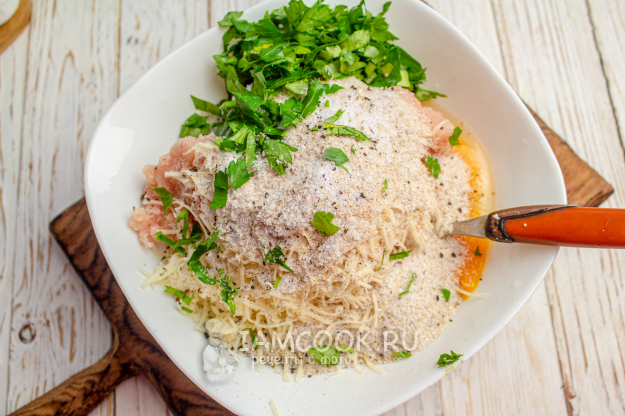 Свежую петрушку мелко нарежьте и добавьте к фаршу, сушеный чеснок, соль и черный молотый перец. Всыпьте отруби.