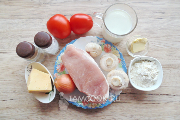 Возьмите все ингредиенты для приготовления мяса по-французски с соусом бешамель по предложенному списку.