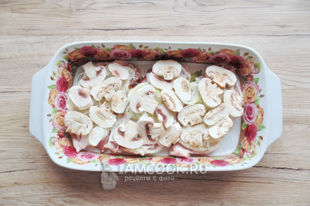 Шампиньоны очистите, помойте и нарежьте пластинами. Выложите на мясо.