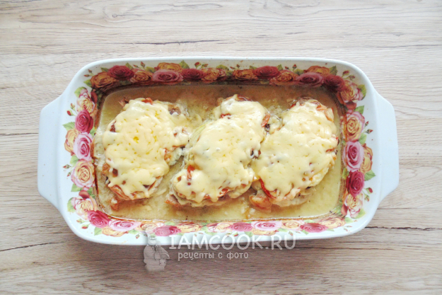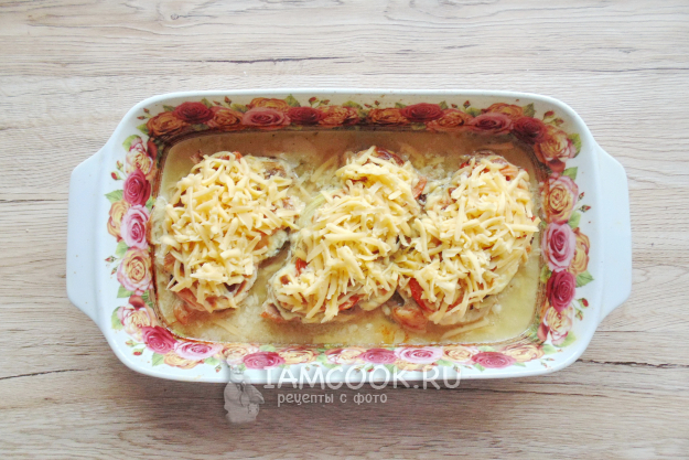 Отправьте в духовку, разогретую до 185-190 градусов, на 35-40 минут. Затем достаньте форму с мясом из духовки. Посыпьте свинину тертым сыром.