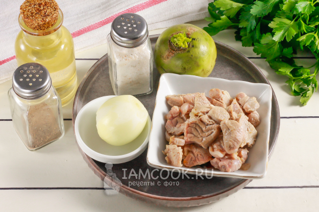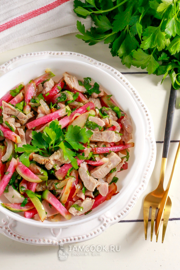 Подготовьте необходимые ингредиенты для создания вкусного салата с жареной редькой и мясом. Мясо отварите заранее до мягкости, лук очистите от шелухи и промойте в воде.